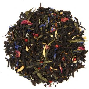 Чай черный индийский, сенча, корень имбиря, корица дробленая, перец розовый, перец черный горошек, лепестки розы, василька, цветы апельсинового дерева, тмин, ароматизатор
