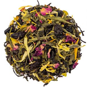 Сочетание чёрного индийского чая и сенчи дополнена изысканным сочетанием папайи, изюма, лепестков розы и календулы. Вкус чая насыщенный терпкий и свежий, сбалансированный с яркой десертно-цветочной нотой, благодаря цукатам и изюму. В сухом виде – россыпь розовых, пурпурных, желтых лепестков и ярких фруктовых кубиков на фоне переплетенных темно-бордовых и нефритовых чайных листьев. Цвет настоя тёмно-янтарный.
