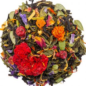 Этот купаж создан для тех, кто ищет не просто чай, а настроение, вдохновение и немного волшебства в каждой чашке. В основе — насыщенный индийский чёрный чай и мягкий зелёный сенча, дополненные ярким букетом лепестков роз, сафлора и мальвы. Цветки граната и апельсинового дерева придают изысканную фруктовую нотку, а кусочки цукатов и красная смородина добавляют сладость и сочность. Лист брусники завершает композицию лёгкой лесной прохладой.