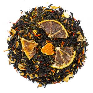 Индийский черный чай, дольки лимона и апельсина, цедра лимона и апельсина, лепестки сафлора, цветки апельсинового дерева, мята, ароматизатор