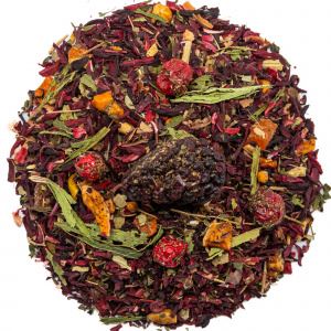 В составе чая есть каркаде, придающий прекрасный багровый оттенок, много фруктов и чрезвычайно хороший запах. Понравился!