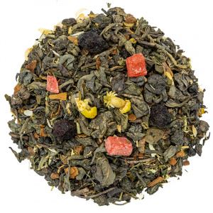 Чай Китайский зеленый Ганпаудер с добавлением боярышника, можжевельника, цукатов, цветами ромашки, а также корицы и орегано (душица), ароматизирован натуральными маслами.