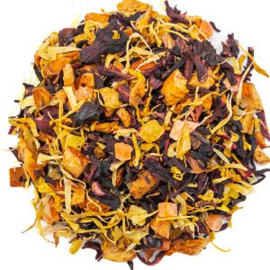 Сочная смесь фруктов, ягод и цветов бордово-оранжевого цвета. В составе яркий гибискус, рубленые садовые яблочки, кусочки ананаса, спелая папайя, оранжевый шиповник и манго. Лепестки подсолнуха украшают микс, знакомым с детства ароматом, ароматизирован натуральными маслами.
