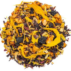 Ярко-красная смесь лепесточков гибискуса, ягод рябины, апельсиновых корочек, сушенного яблока и кусочков персика, обрамленная натуральными эфирными маслами. В сухом виде выглядит притягательно: алый, оранжевый, солнечно-желтый и багровый цвета удивительно складно сочетаются, несмотря на свою яркость. Красиво заваривается в посуде с прозрачными стенками: гибискус и кусочки фруктов гипнотизируют своим кружением.