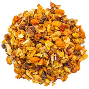 Этот чай похож на золотую осень: ярко-оранжевые, горчичные, желтые оттенки с бордовыми вкраплениями. В основе – мелкомолотые ягоды сочной облепихи, обрамленные кусочками сладкой груши, спелых яблок и ягодами красноплодной рябины. Такое сочетание ягод и фруктов превращает этот напиток в витаминный коктейль, незаменимый в сезон простуд и холодов. Смесь лишь условно называется чаем: в ней только ягоды и фрукты. Поэтому напиток можно давать детям, старикам, пить при проблемах с давлением.