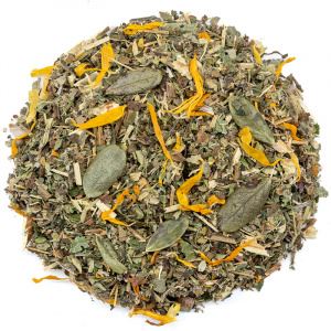 Лист малины, земляники, черной смородины, лепестки календулы, толокнянка, душица, мята, чабрец, корень солодки, крапива.