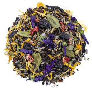 Основа напитка известный своими целебными свойствами и мягким вкусом Иван-чай, а мальва добавляет нежные цветочные нотки, чай приобретает изысканный аромат и гармоничное послевкусие. Брусничные листочки придают легкую кислинку и тонкие ягодные оттенки, лаванда обладает успокаивающим и расслабляющим эффектом. Кусочки клубники и ягоды черной смородины обогащают вкус чая сладкими и насыщенными фруктовыми акцентами, создавая яркую и гармоничную палитру. Медовые гранулы придают чаю легкий медовый оттенок и натуральную сладость, завершая композицию и делая напиток особенно ароматным и насыщенным.