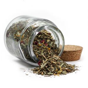 Ройбуш, шалфей, мята, мелисса, лемонграсс, цедра апельсина, лист земляники, лепестки розы, календулы.