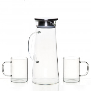 В комплекте две чашки большого объема. За счет универсального дизайна они впишутся в любой посудный шкафчик. Сам кувшин выполнен в минималистичном стиле. Рядом с ним будет органично смотреться любая посуда. Стенки у сосуда прозрачные, что дает возможность любоваться его содержимым, делать ставку на оригинальный цвет или необычные компоненты напитка.