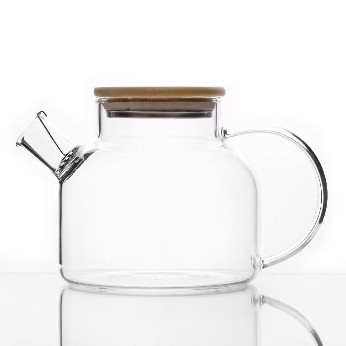 Стеклянный чайник с бамбуковой крышкой. Продукт изготовлен из более толстого термостойкого стекла.